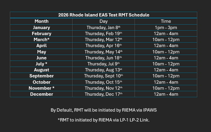 On the state level, The Rhode Island Broadcasters Association works closely with the RI Emergency Management Agency (RIEMA) to coordinate EAS tests and stands ready to assist stations and the public in times of emergency.
